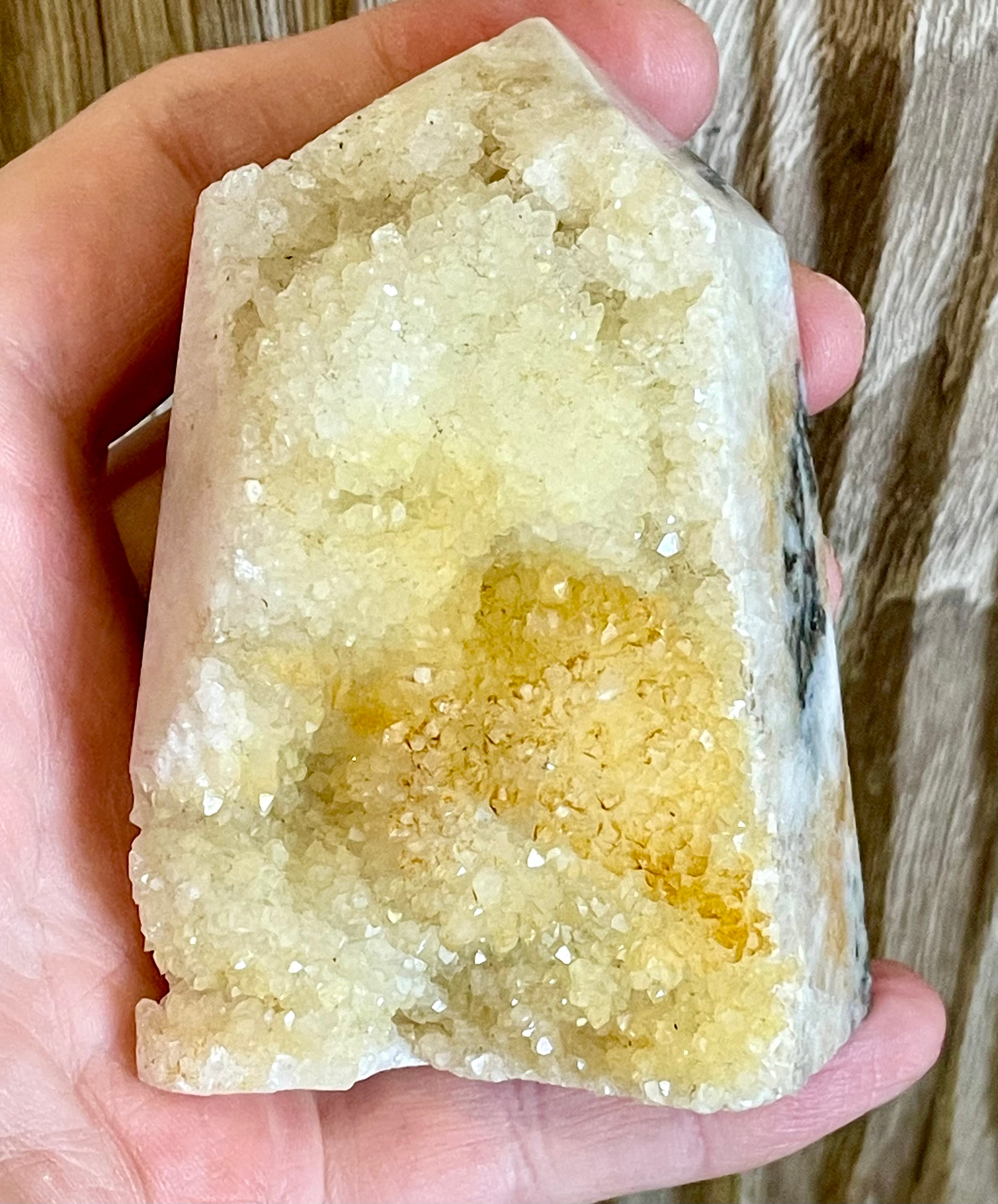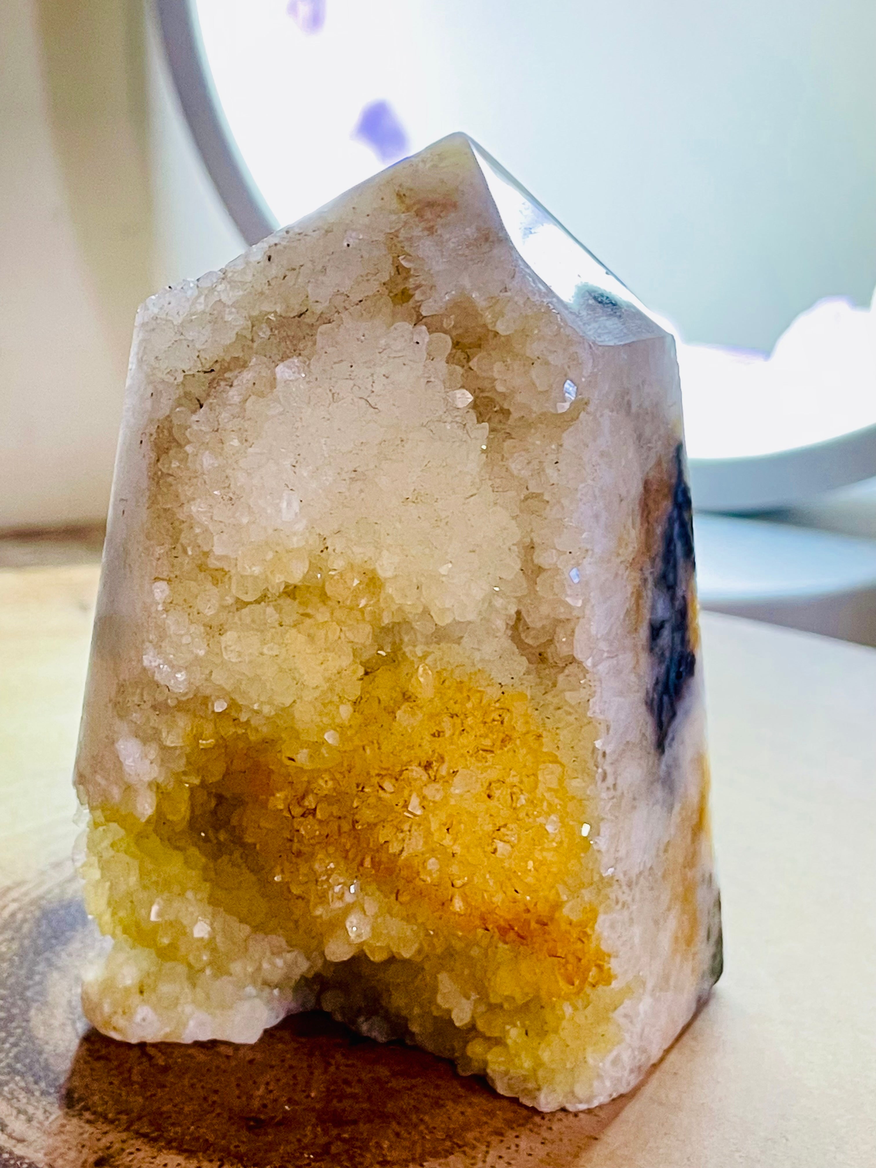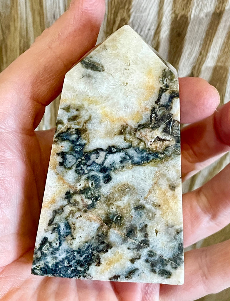 This chunky tower is not just a beautiful decoration, it also has healing properties. With the combination of calcite and tree agate, it supports healing and brings a sense of calm and balance. Experience the benefits of these minerals in one stunning piece.